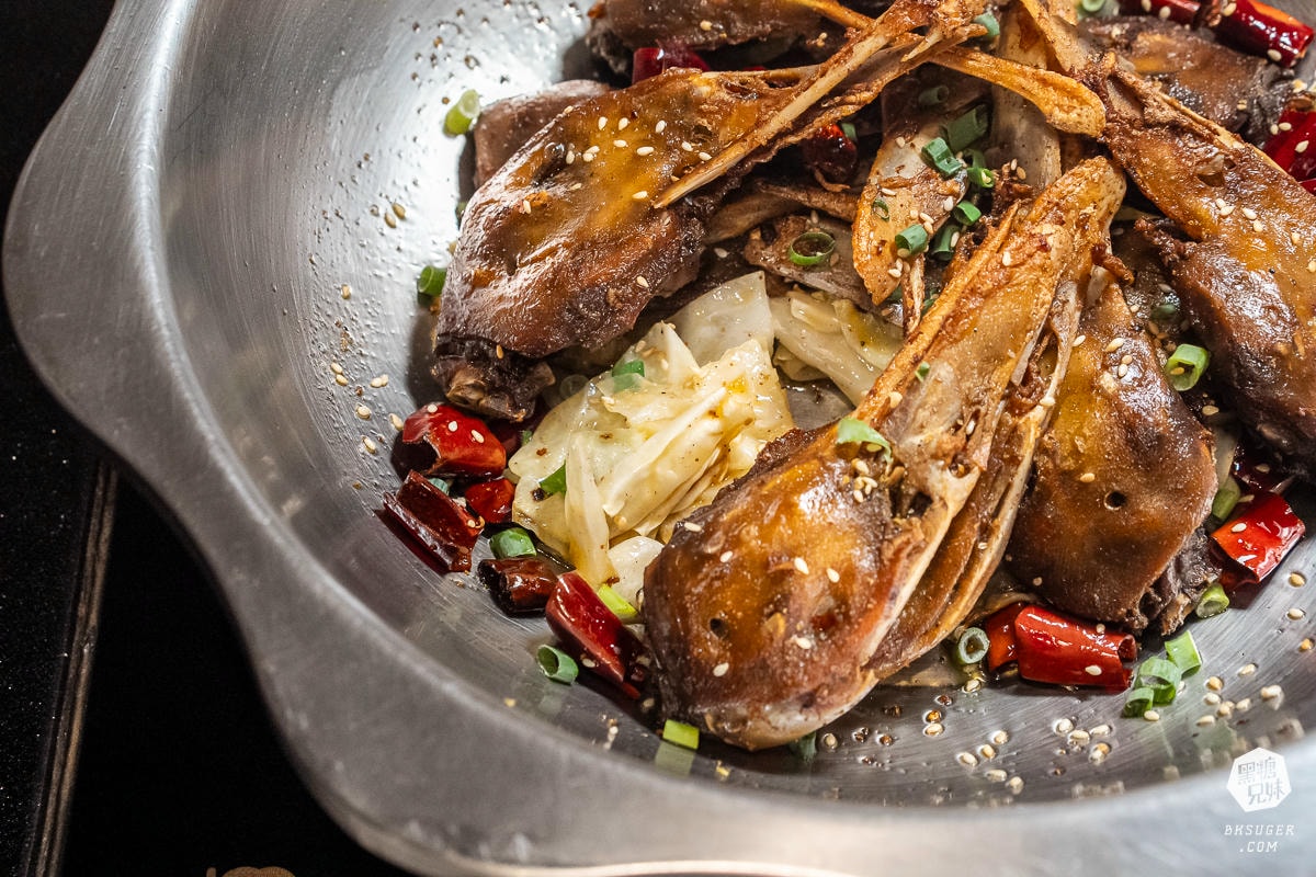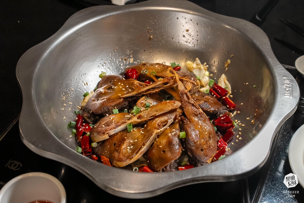 一上桌就能感受到香氣四溢的干鍋鴨頭,鴨頭本身滷得入味,帶點辣度與香料氣息。