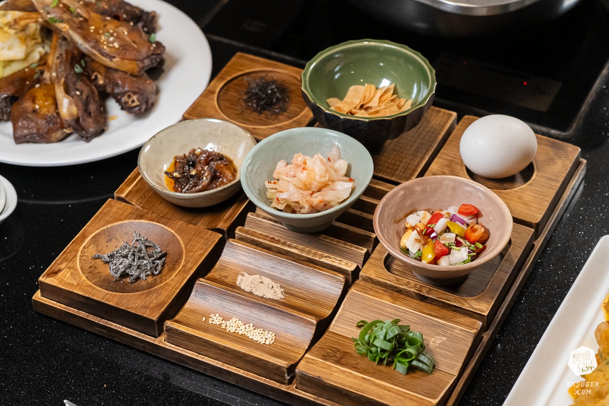 這是一個意想不到的驚喜!服務人員會利用干鍋鴨頭留下的鍋底,加入龍鳳高湯、白飯、雞蛋,再搭配特製的九宮格調料。