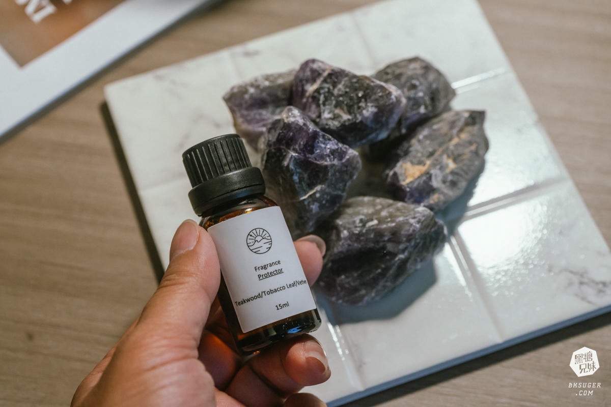 將精油滴在晶石上的那一刻,柚木的清新香氣立刻撲鼻而來。