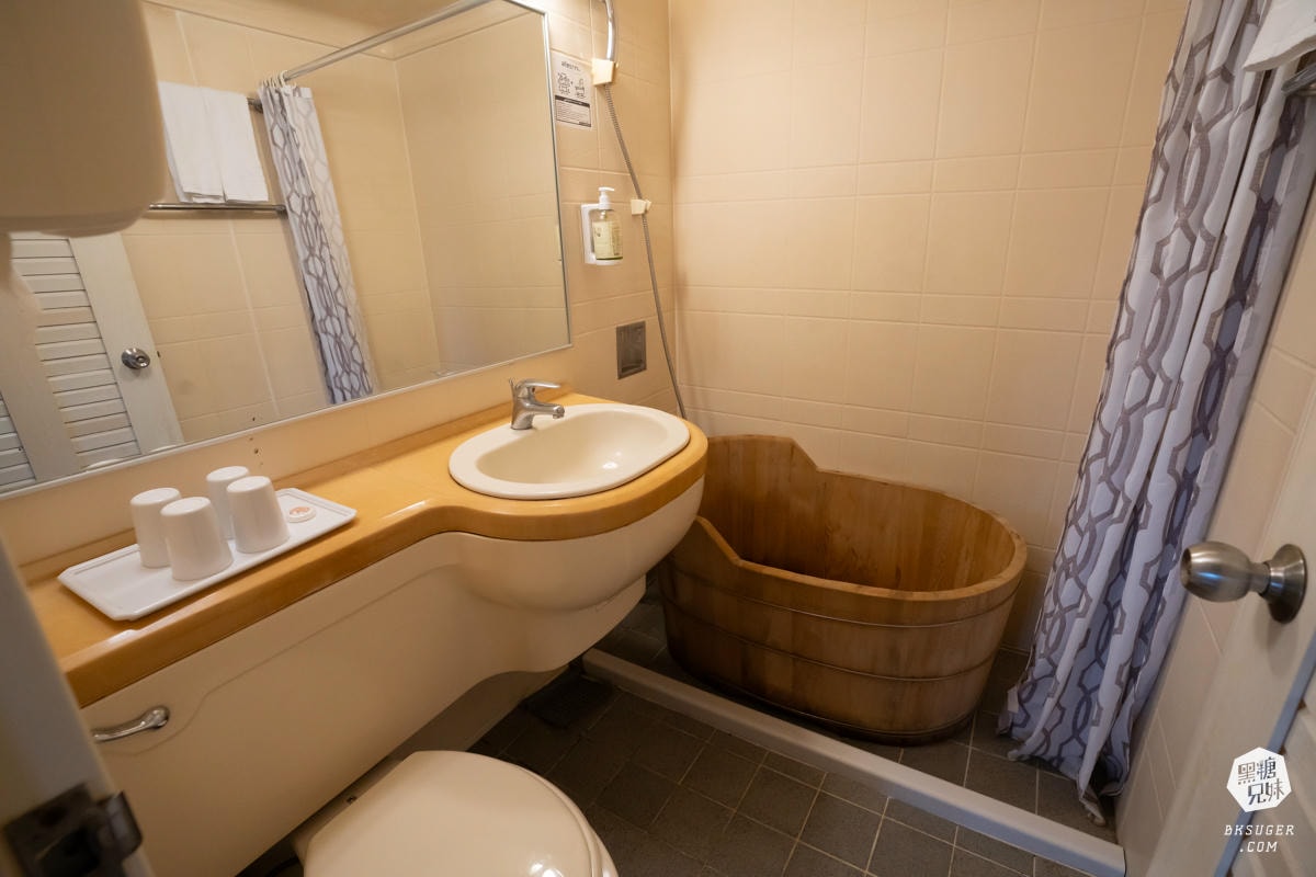 浴室較迷你,但有乾濕分離浴簾與檜木泡澡桶,晚上泡澡時木香環繞,讓人完全放鬆。