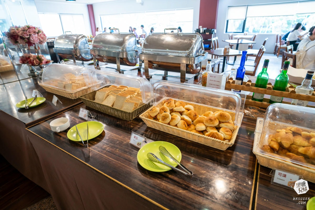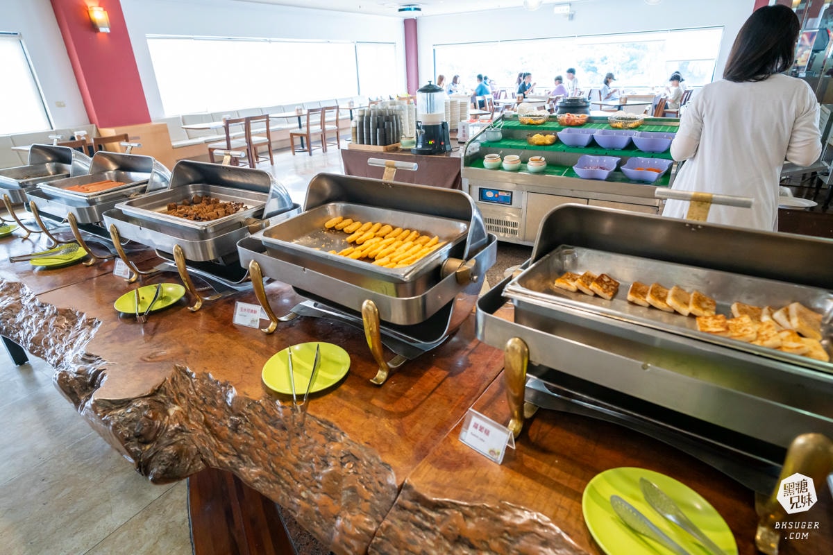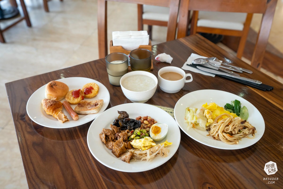 早餐是自助式餐點,中西式選擇豐富,有清粥小菜、現炒蔬菜,也有麵包、水果與果汁。