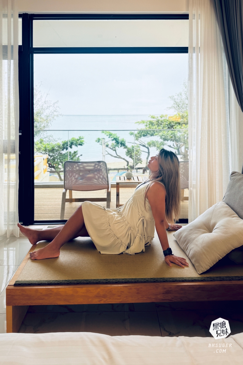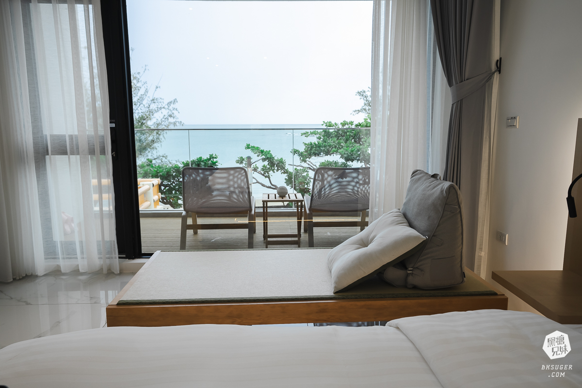 另一個很特別的亮點是房內的榻榻米坐台,設計在靠窗的位置。白天可以窩在這裡看書、喝茶,夜晚則是靜靜聽著浪聲,無論發呆或聊天都特別愜意。