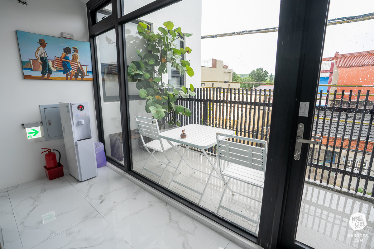 電梯來到二樓,外有陽台採光超棒,也主打環保旅館,提供水壺可以自己出來飲水機裝飲用水(這真是黑糖最喜歡的模式)