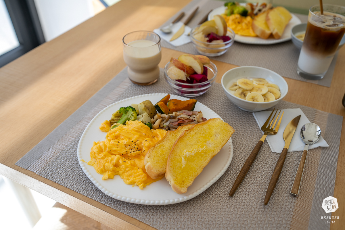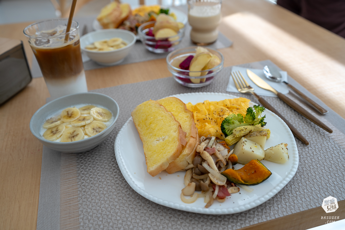 有烤麵包、美式炒蛋,以及大量時蔬。